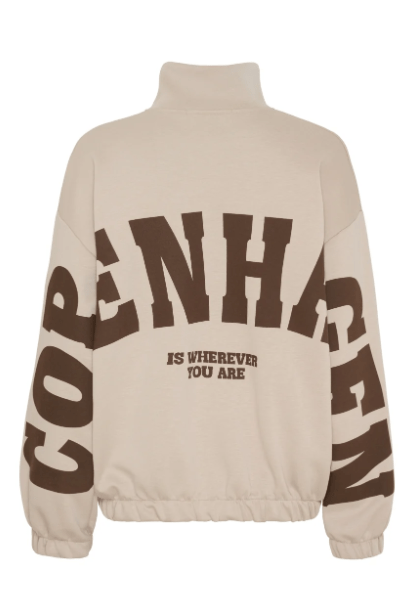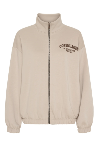 Cardiganen har høj krave, lynlåslukning foran, elastik ved talje og ærmer samt grafisk tekstprint på bryst og ærmer, som giver et sporty og moderne udtryk.
