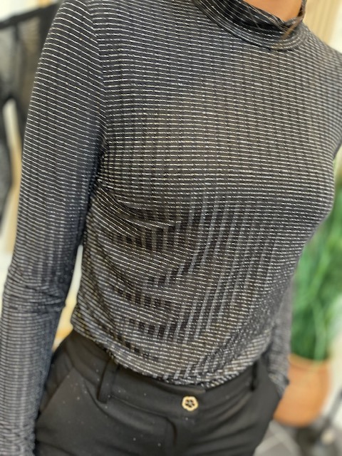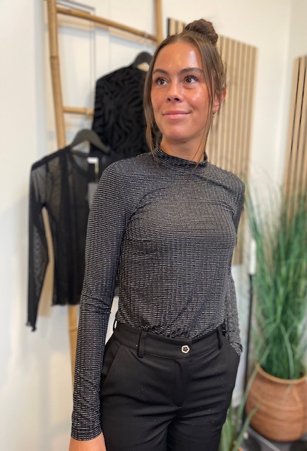 Sort/sølv bluse med tæt siddende pasform fra Nümph. Style den under en kjole eller under en vest, eller bare som den er.