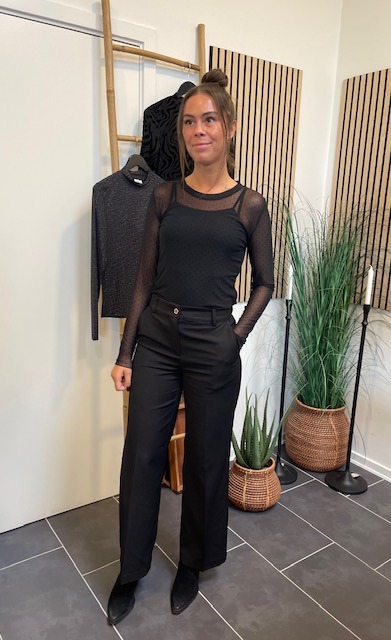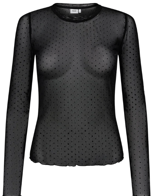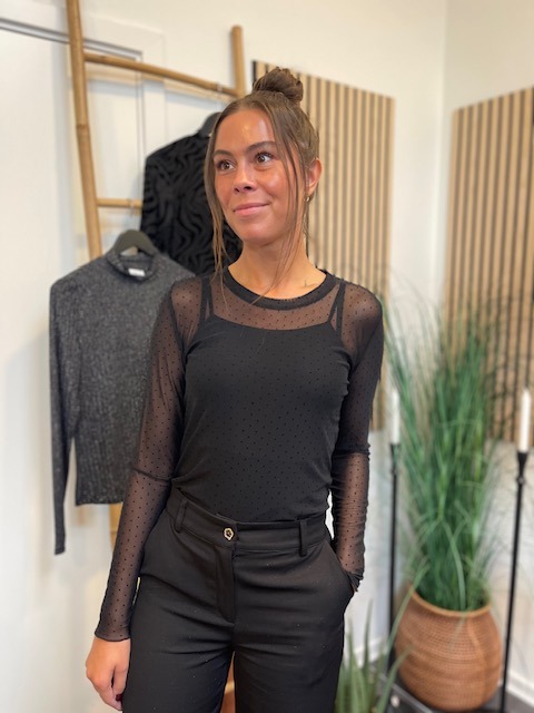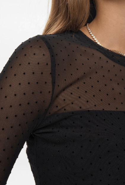 Fin sort meshbluse med all over sorte prikker fra Nümph. Style den under alt fra dine kjoler, til en tynd bluse og under en strik.