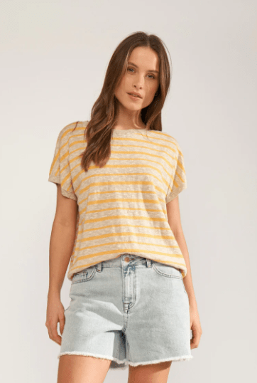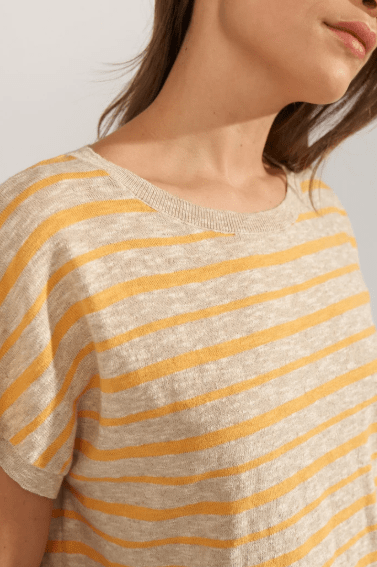 Skøn bluse i gul/sandfarvet striber fra Numph. Blusen er kort og rummelig og er perfekt at style over en basisbluse. Style den til alt fra shorts, bukser og til en nederdel.