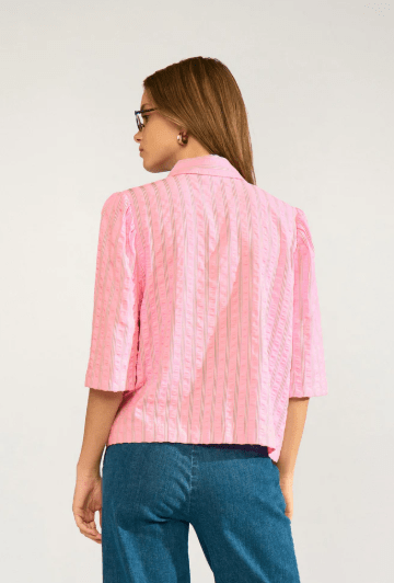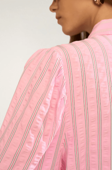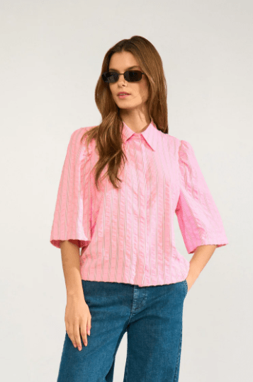 Moderigtig skjorte i lyserød med hvide striber fra Nümph. Skjorten har 7/8 længde ærmer og den er kort og lidt bred i modellen. Perfekt at style til både bukser, shorts og til en nederdel.