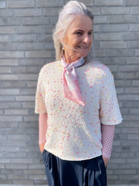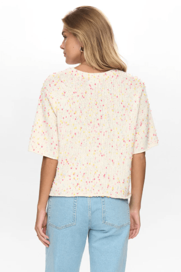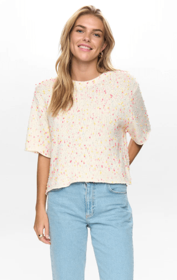 Flot let forår/sommer strik fra Nümph. Skøn lys farve med multifarvede nister. Blusen har et godt lille ærme og en løs pasform.
