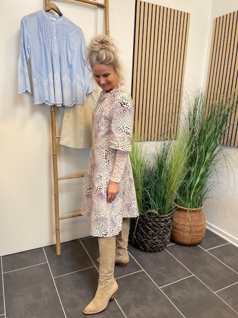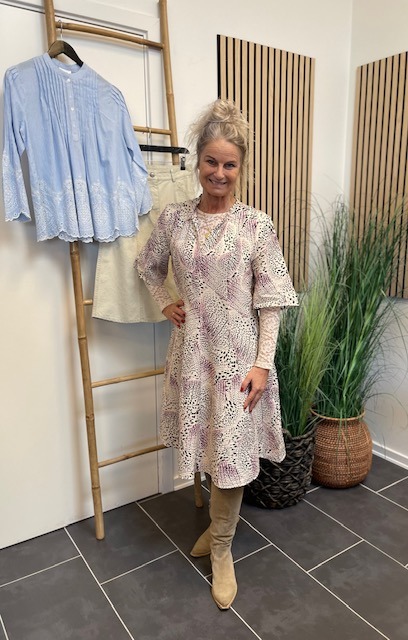 Flot kjole i lyse farver fra Nümph. Kjolen er til dig, som gerne vil vise lidt figur uden at kjolen sidder helt stramt.