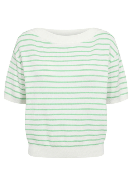 Skøn og super blød bluse i lysegrøn/offwhite striber fra Nümph. Den har et fint lille ærme og er nem at style til både shorts, bukser og til en nederdel.