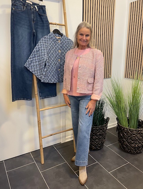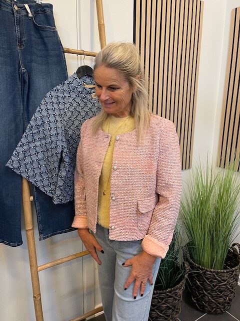 Smuk kort rosa farvet jakke i “Chanel” stil fra Nümph. Cool til jeans og altid nem over en kjole og til en nederdel.