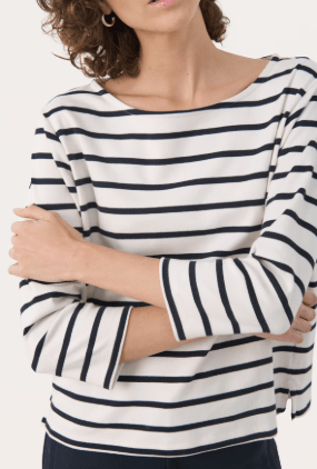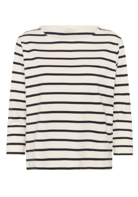 Denne stribede bluse i bomuldskvalitet har et tidløst design med bådudskæring og trekvartlange ærmer. Den afslappede pasform gør den perfekt til hverdagen – style den med denim for et klassisk look eller under en blazer for en mere struktureret silhuet. Blusen har mørkeblå striber.