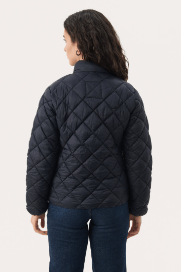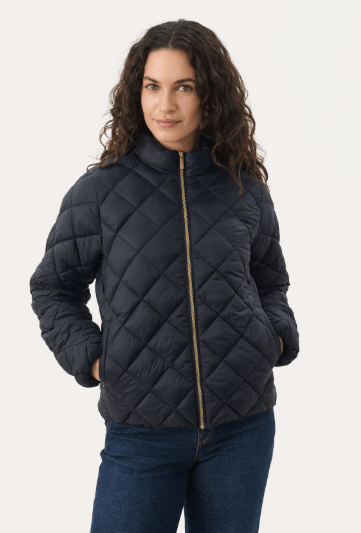 Klassisk kort dun jakke i marineblå fra Part Two. Den er let og luftig og alligevel dejlig varm. En skøn jakke du kan have i mange år.
