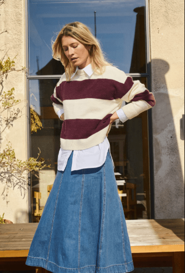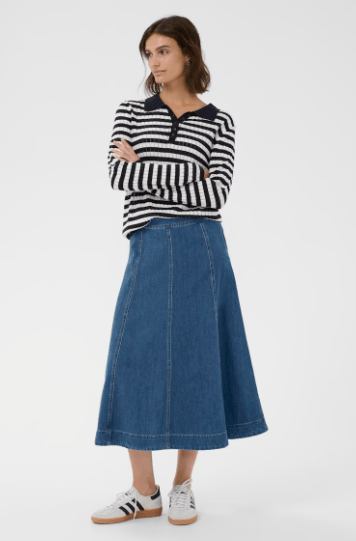 Denne A-formede denimnederdel har en flatterende, svingende silhuet og synlige sømme, der giver et moderne udtryk. Den midi-lange længde gør den perfekt til både hverdag og afslappede weekenddage. Style den med en strik eller en skjorte alt efter humør og sæson. Flot lys vask.