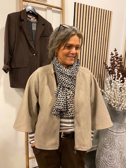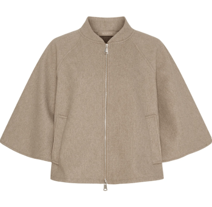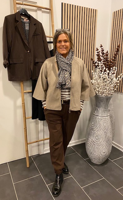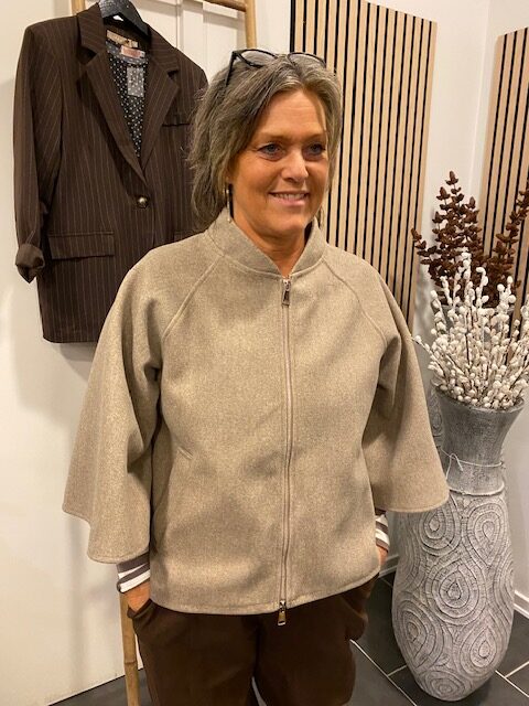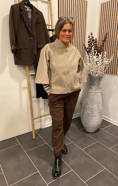 Sej kort jakke med bredde 3/4 ærmer. Farven hedder Fango og er lidt nougat agtig. Brug den indendørs nu og som overtøj til foråret. Jakken Har lynlås og lommer.