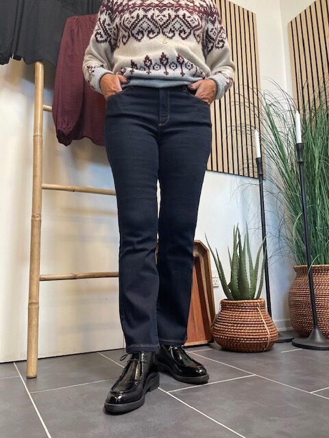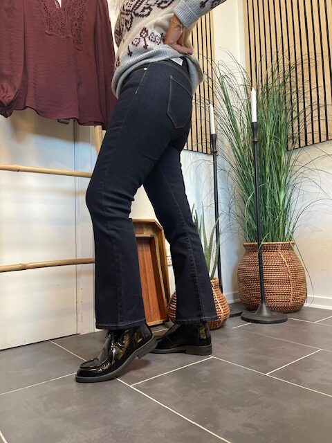 Mega lækker jeans i en flot dyb mørk vask fra Pieszak. Buksen har flare forneden og kort benlængde.