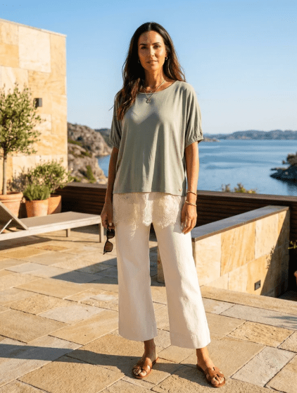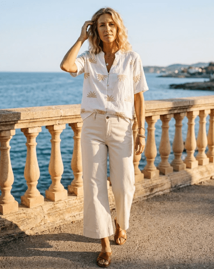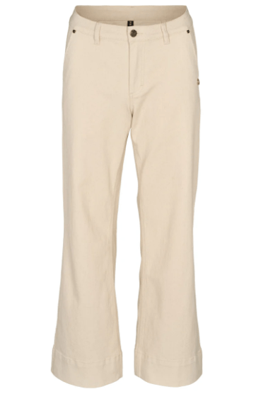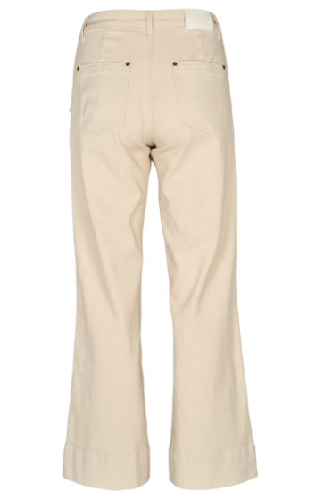 Malia Jeans er en super lækker jeans i en fin Off White farve med vidde. Bukserne har mellemhøj talje og fast linning med bæltestropper, to sidelommer samt to baglommer. Benene afsluttes med en bred, påsyet kant forneden, som giver et markant og struktureret udtryk. Bukserne er med lynlås og en enkelt knap og er i en blød og lækker kvalitet.