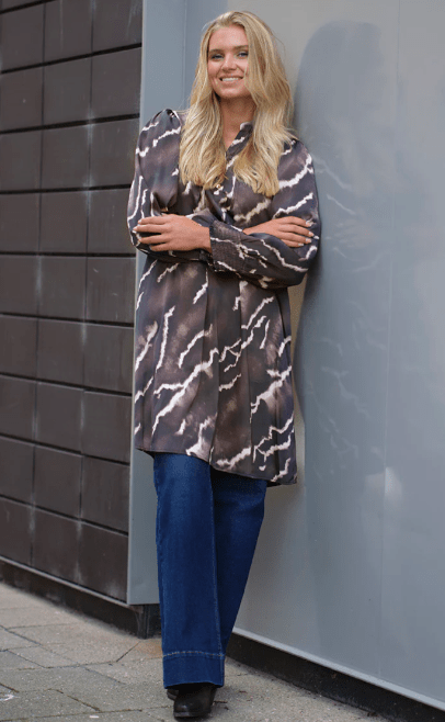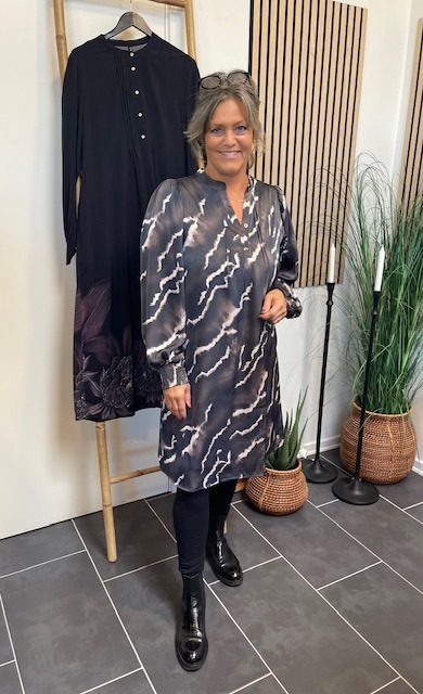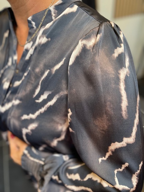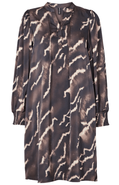 Olivia Dress med et moderne tie-dye inspireret print i mørke og lyse nuancer. Kjolen har rund hals med en lille v-udskæring med knaplukning og fine feminine læg ved brystet, lange ærmer med et let puffede skuldre og smock-detaljer ved manchetterne.