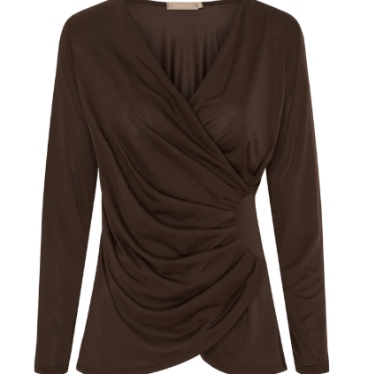 Super fin brun bluse fra Marta du Château med slå-om effekt. Blusen har lange ærmer og V-udskæring. Kan styles med en nederdel for et finere look eller et par jeans og en grov støvle til hverdagsbrug.