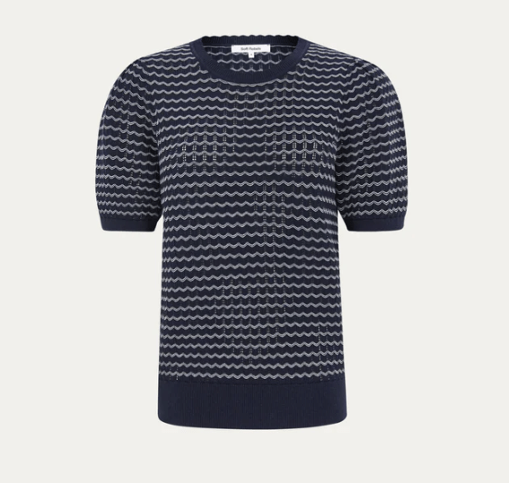 Den har rund hals og ribkanter ved hals, ærmer og forneden.