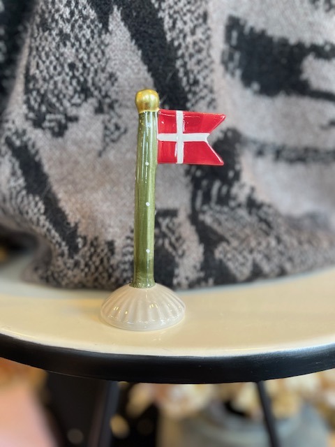 Fint lille keramik flag med grøn stang og beige fod.