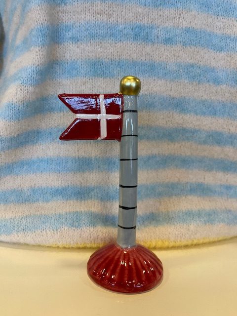 Lille keramikflag fra Speedtsberg. Her er stangen lyseblå med tynde sorte striber og foden er rød. En alletiders gaveidé.
