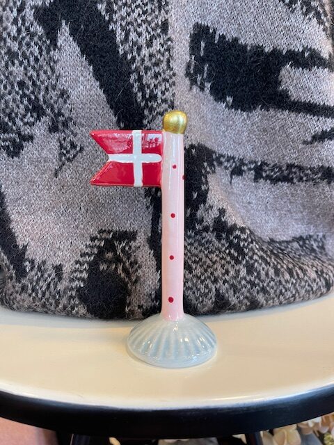 Fint lille keramik flag fra Speedtsberg. Stangen er Lyserød med røde prikker og foden er lyseblå. En alletiders gaveidé.