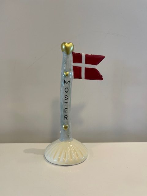 Fint lille keramikflag med MOSTER skrevet på den lyseblå stang. Foden er her lysegul. En alletiders gaveidé til moster.