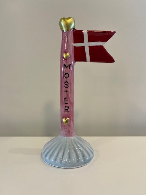 Sødt lille keramikflag med MOSTER skrevet på den rosafarvet stang. Foden er lyseblå. Alletiders gaveidé.