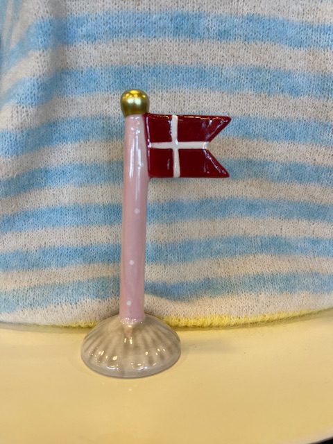 Endnu et fint lille keramikflag fra Speedtsberg. Stangen er Rosa med prikker og foden er beige/nougat.