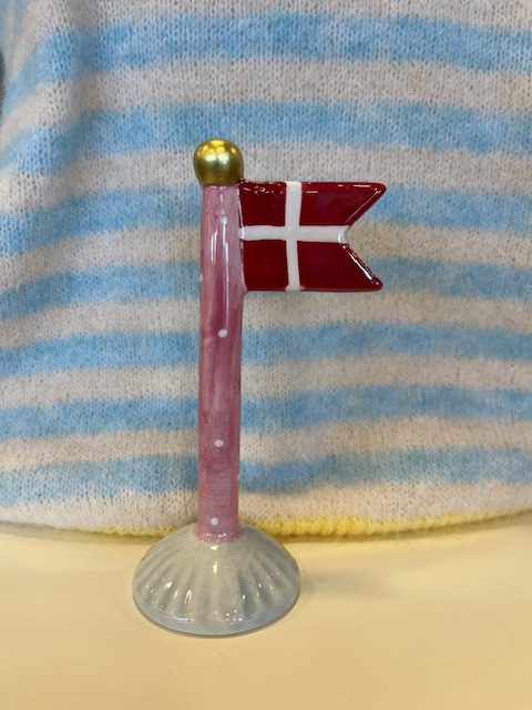 Fint lille keramikflag med mørk rosa farvet stang med prikker og lyseblå fod. En alletiders gaveidé.