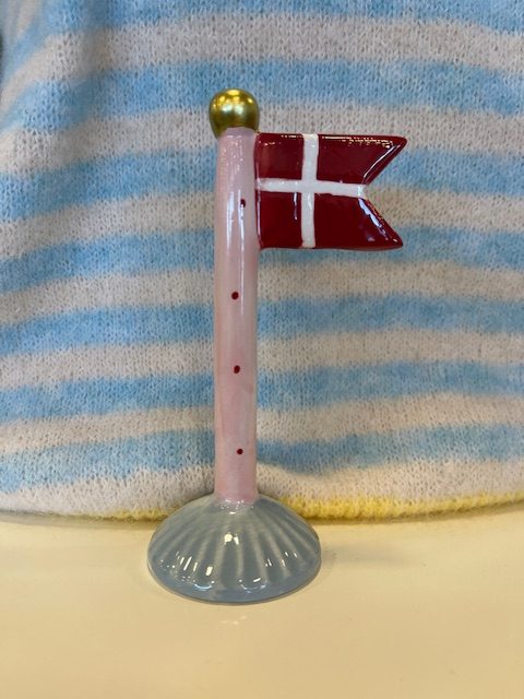Fint lille keramikflag fra Speedtsberg. Her er stangen lyserød med røde prikker og foden er lyseblå. Alletiders gaveidé.