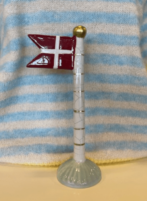 Anderledes dansk keramik flag. Stangen er i “krakeleret” creme farve med guld striber og mint farvet fod. Alletiders gaveidé.