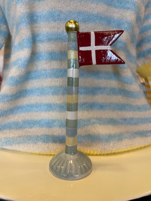 Flot multifarvet keramik flag fra Speedtsberg. Stangen er stribet i grøn/gul/blå farver og foden er lyseblå.
