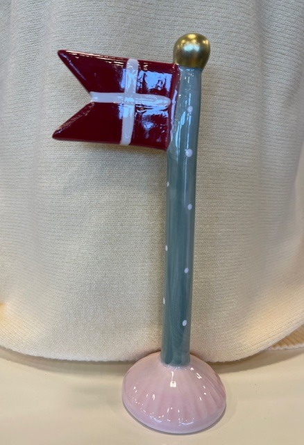 Stort keramikflag fra Speedtsberg. Her er stangen grøn med hvide prikker og foden er lyserød.