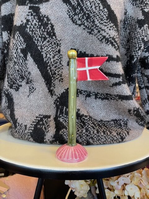 Stort keramik flag fra Speedtsberg. Stangen er grøn med prikker og foden er melon farvet.