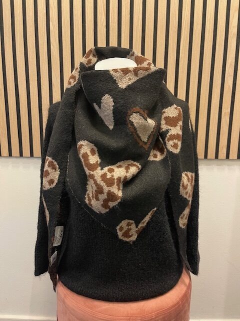 Lækkert og moderigtigt 3-kantet tørklæde fra Three M. Det er sort med hjerter i brune og gyldne farver.