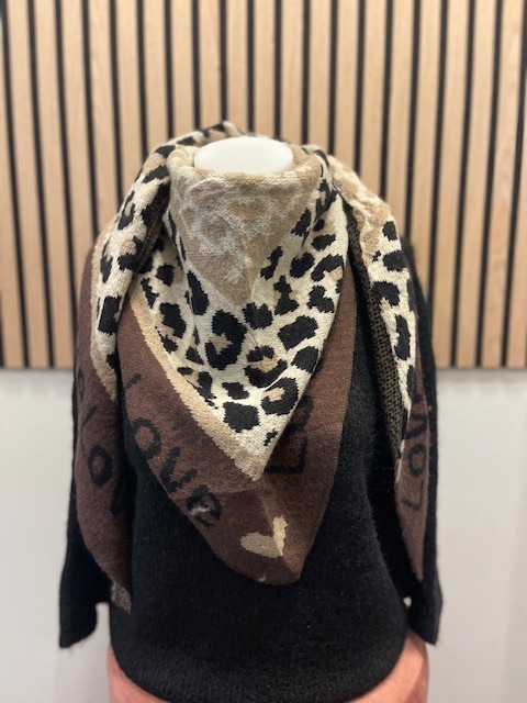 Lækkert og moderigtigt 3-kantet tørklæde fra Three M. Det er beige/brun/sort.