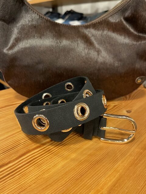 Smalt sort bælte med guld (en snært af rosa guld ) ringe. Bæltet kan nemt bruges til både bukser og til nederdele.