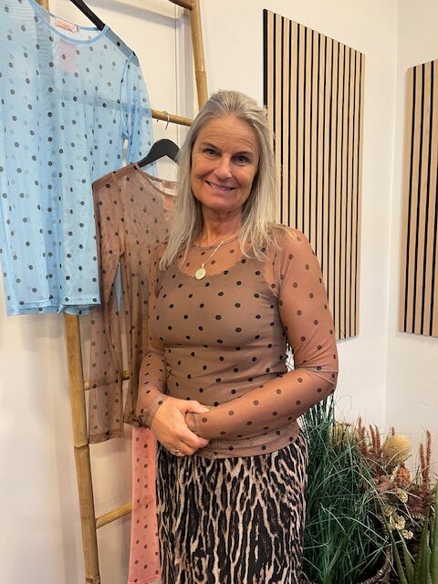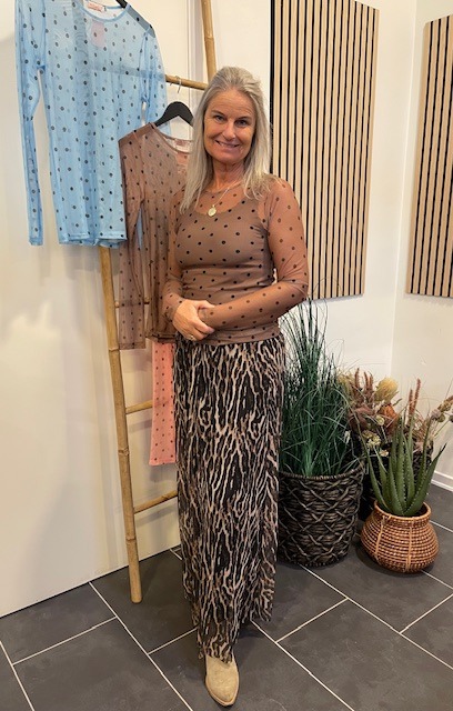 Moderigtig brun meshbluse med prikker fra Three m. Den er nem at style under alt.