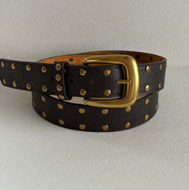 Lækkert mørkebrunt skind bælte med messing farvede nitter fra Three M.