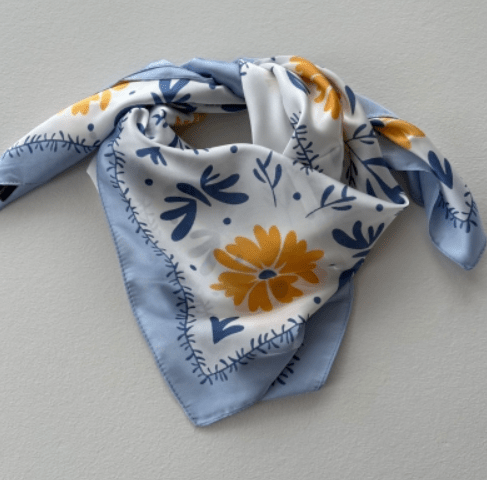 Fint lille tørklæde i blå/hvid/gule farver fra Three M.