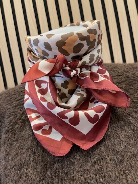 Fint lille firkantet tørklæde i silke mix fra Three M. Der er leoprint og en bordeaux farvet kant.