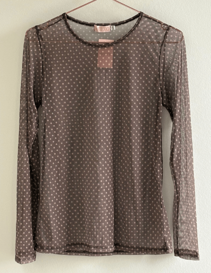 Skøn brun meshbluse med prikker fra Three M. Den er perfekt at style under alt og farven passer til alle de lyse farver.