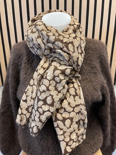 Blødt og flot tørklæde i brun/camel farvet print fra Three M.
