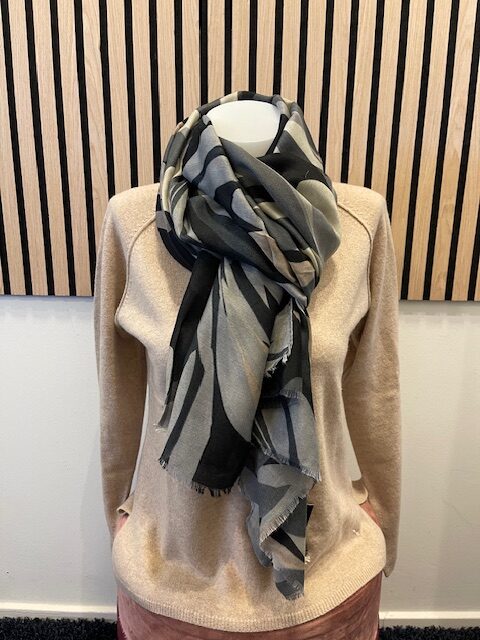 Lækkert tørklæde i et abstrakt print i sort/grå/beige fra Three M.