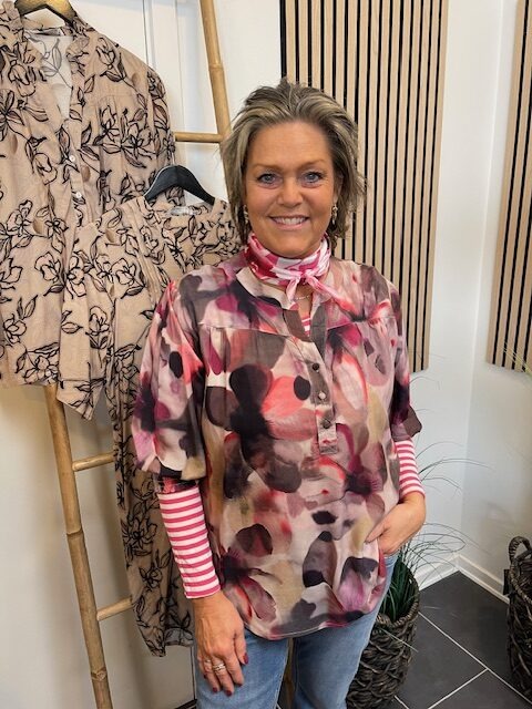 Skøn bluse i flotte farver fra Vanting. Blusen har et fint lille ærme med smockkant og den er nem at style til både bukser og til en nederdel.