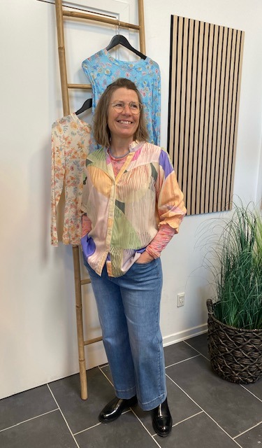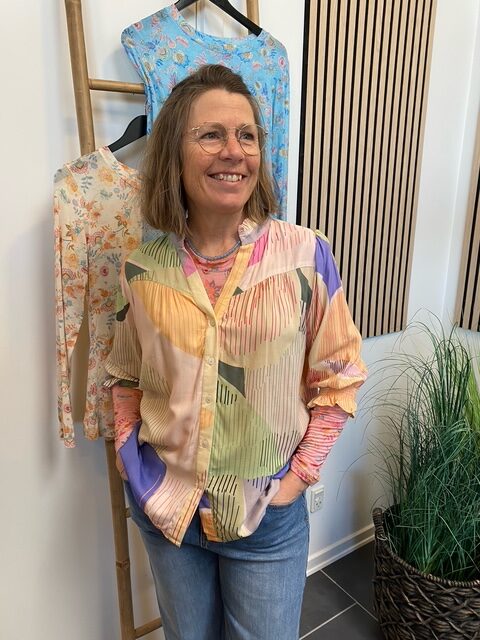 Skøn skjorte i lækre farver fra Vanting. Skjorten har 3/4 længde ærmer som afsluttes med smock.