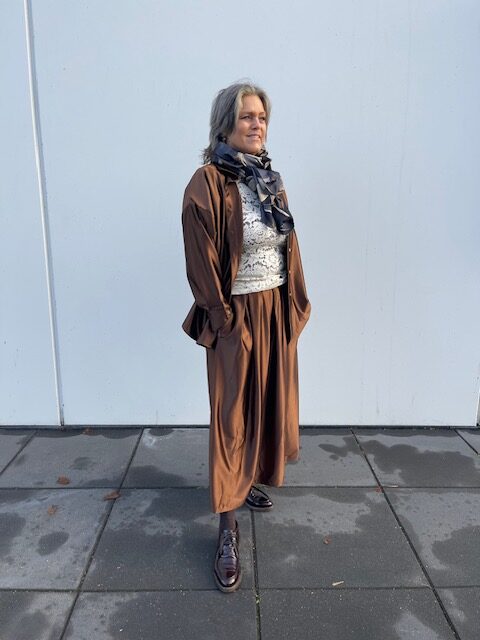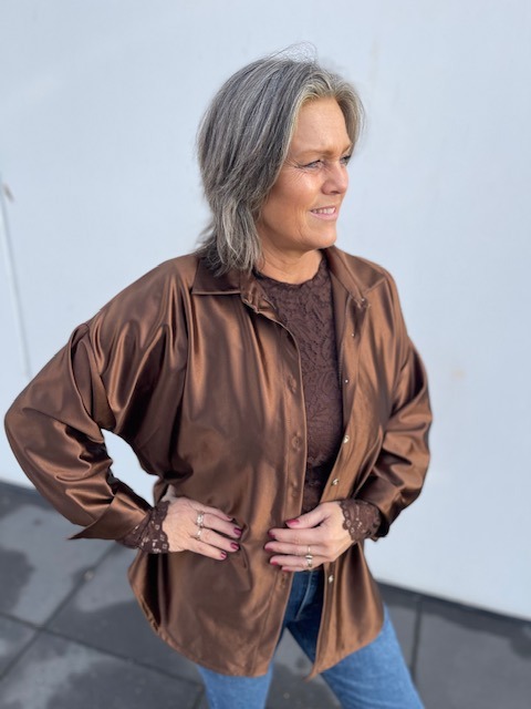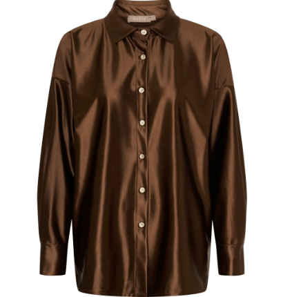 Flot brun satin skjorte fra Marta. Vi har nederdel i samme metervare, til dig, som ønsker et sæt.